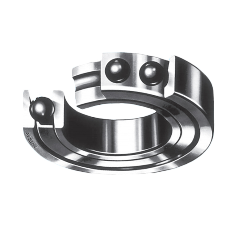 (1) 雙列角接觸球軸承-將單列角接觸球軸承背對背雙聯(lián),內(nèi)圈、外圈各自成為一體的結(jié)構(gòu)??梢猿惺芏€方向的軸向載荷,有力拒載荷能力。可以作為固定端軸承使用,使用沖壓保持架。